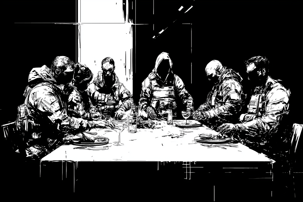 A radio crackles. Not ours. The one we took from the advance team member who breached the back door four hours ago and made it six feet into the mudroom before Yun put two rounds center mass. The dead man's radio sits on the counter between the camp stove and the chili crisp, and every few minutes someone on the other end says a call sign and waits for a response that will never come.